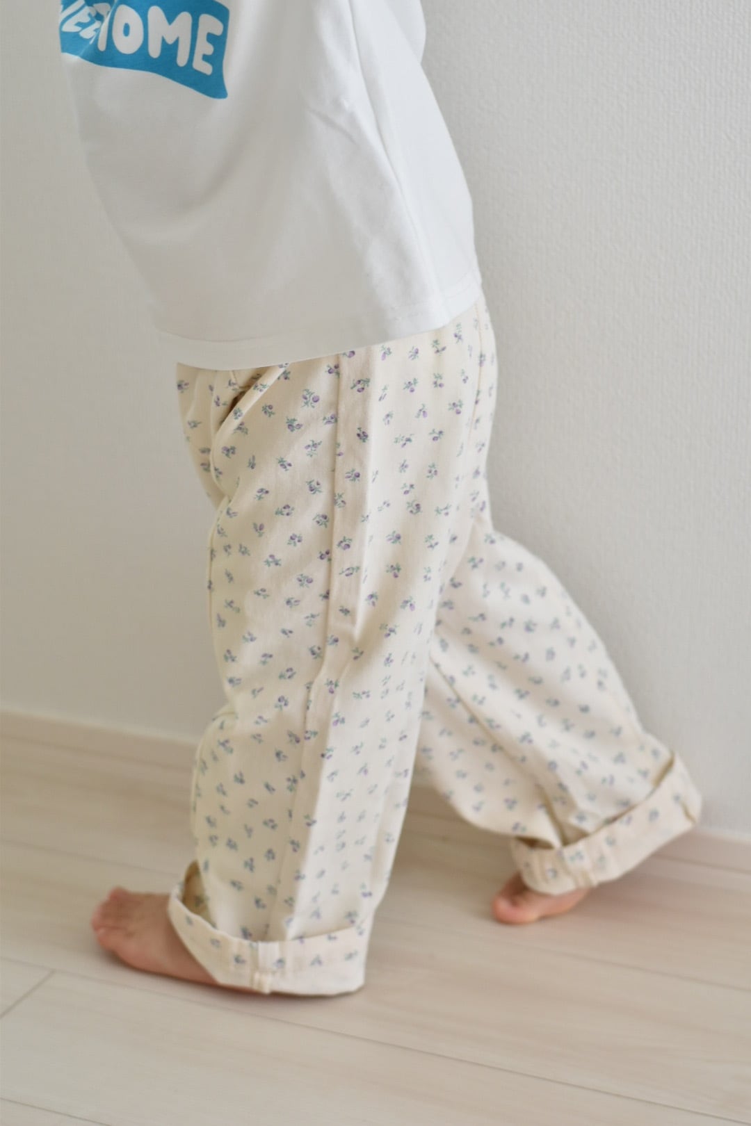 繊細な小花柄が全体に散りばめられたリラックスパンツ。