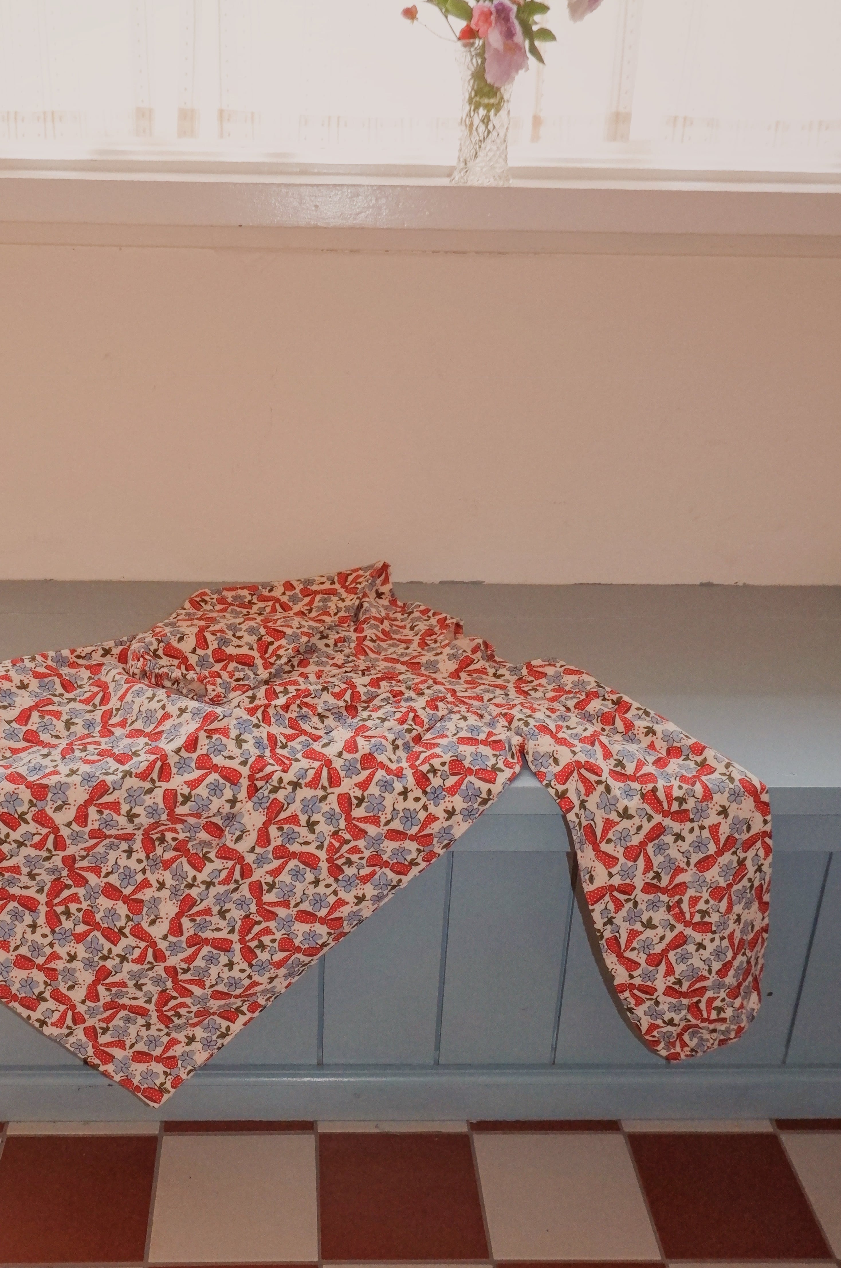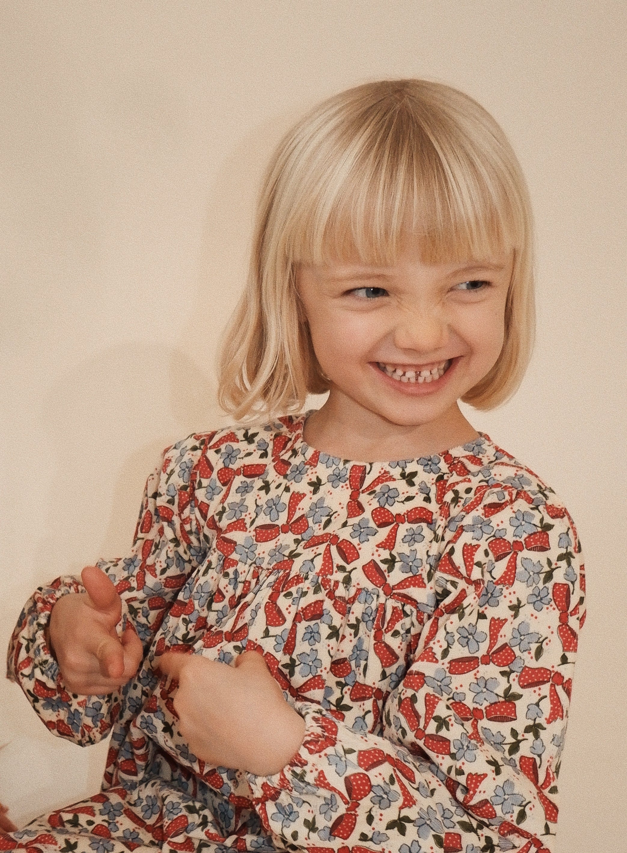 柔らかなコットンコーデュロイにリボンとお花の可愛いプリントをあしらったワンピース。