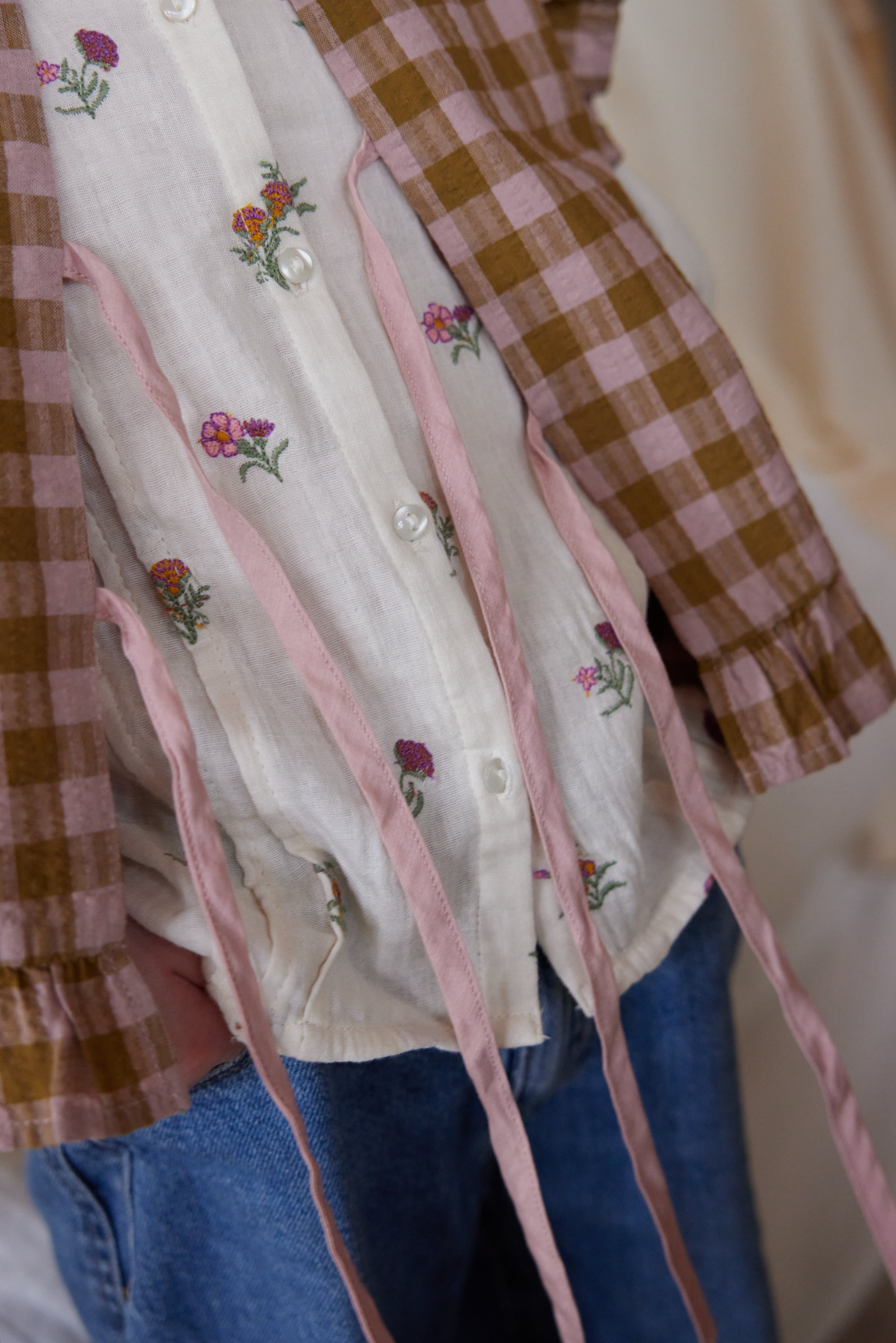 フロントタイとラッフルがアクセントになり、スタイリングを華やかに仕上げます。