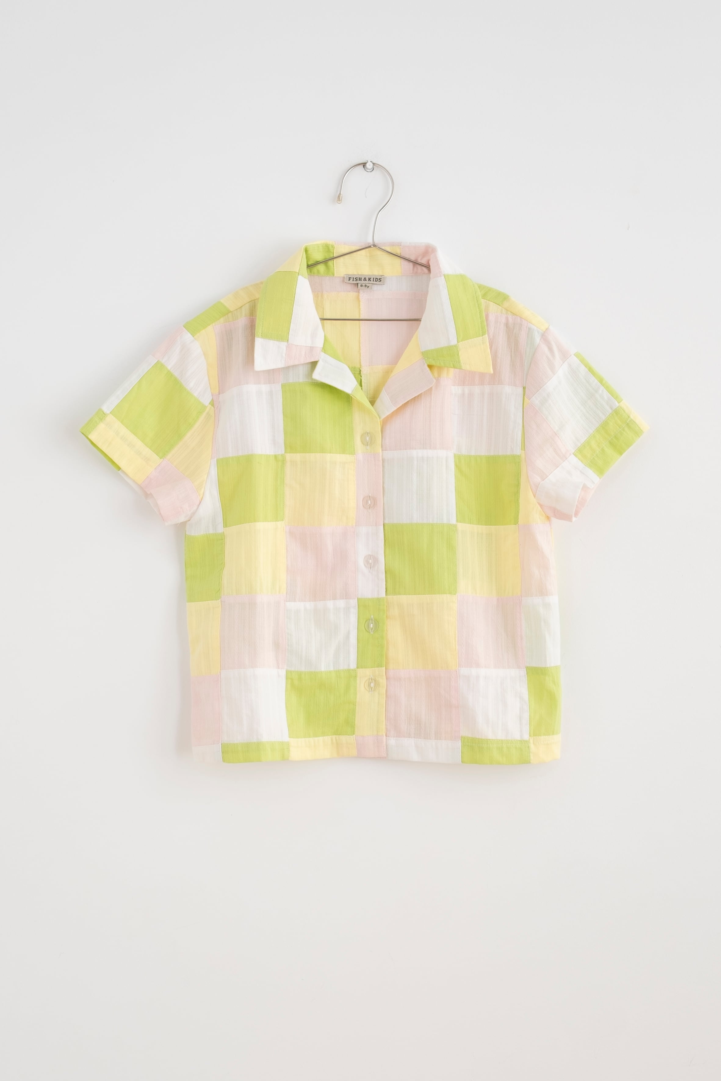 シャーベットのような淡いトーンのパッチワークが印象的な半袖シャツ。