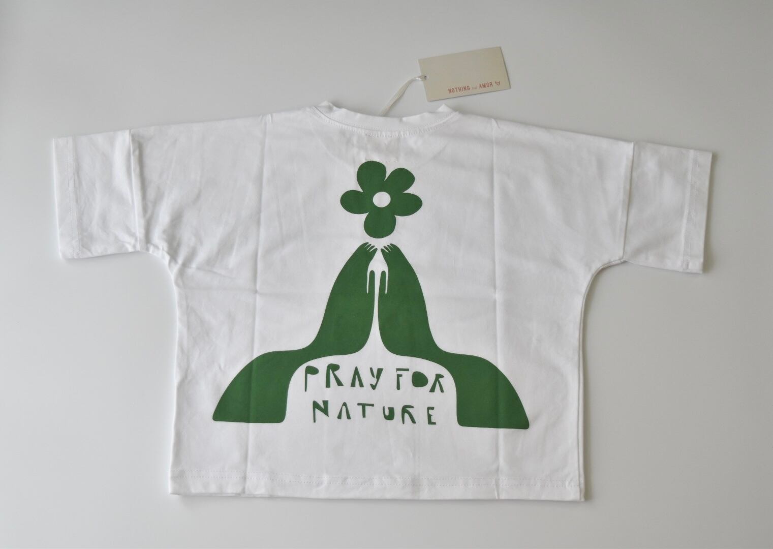 前後に『PRAY FOR NATURE』のロゴアートがプリントされたTシャツ。